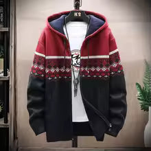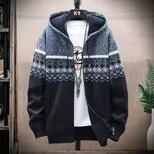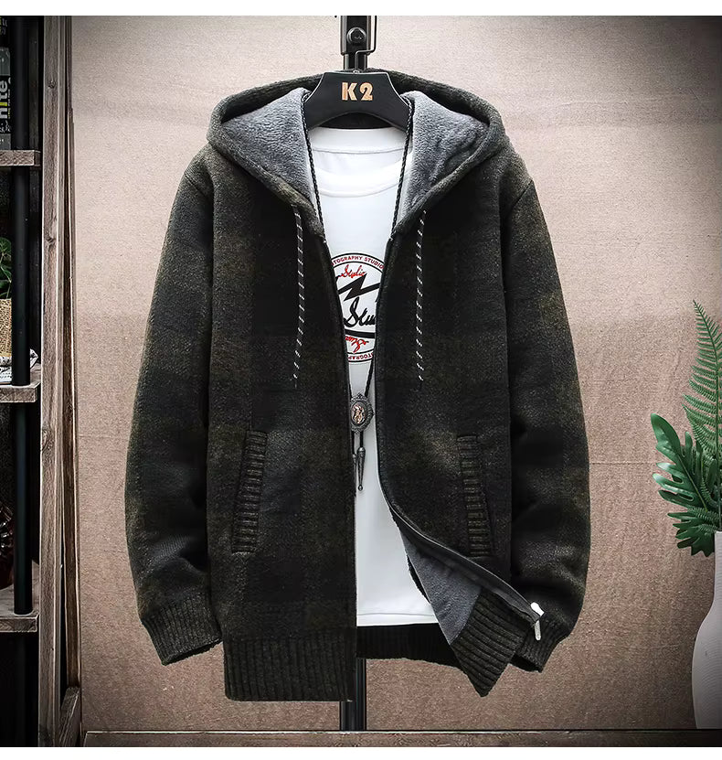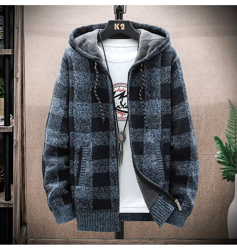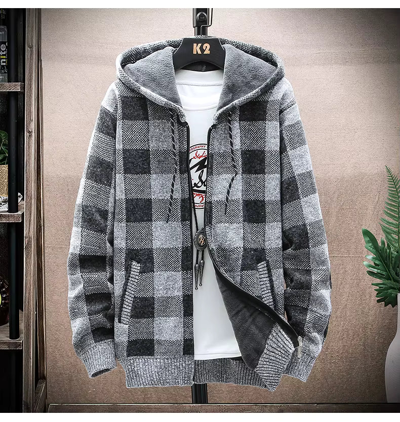 Men's New Winter Plaid Sweater Hooded Cardigan Cold Coat Wool Zipper Jacket Autumn Fleece Warm Clothes Checkered Knit Jumper